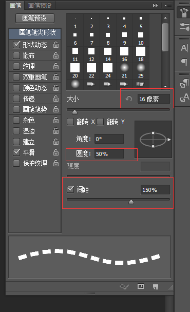 按下F5,调节参数,使之可以形成虚线。第一个数值大小表示的是一个段虚线的长度。圆度表示了是控制虚线的宽度。所以宽度=大小×圆度。间距表示的是每端间隔150%-100%的宽度。