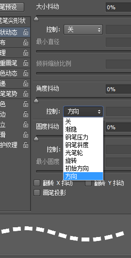 形状动态中,控制选择方向,使之可以顺着钢笔所示路径的放线